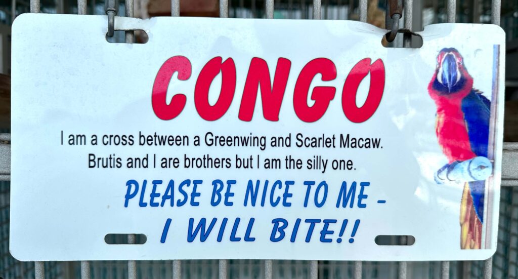 Each bird has a name displayed on its cage, along with a very honest reminder for visitors—“I will bite!”