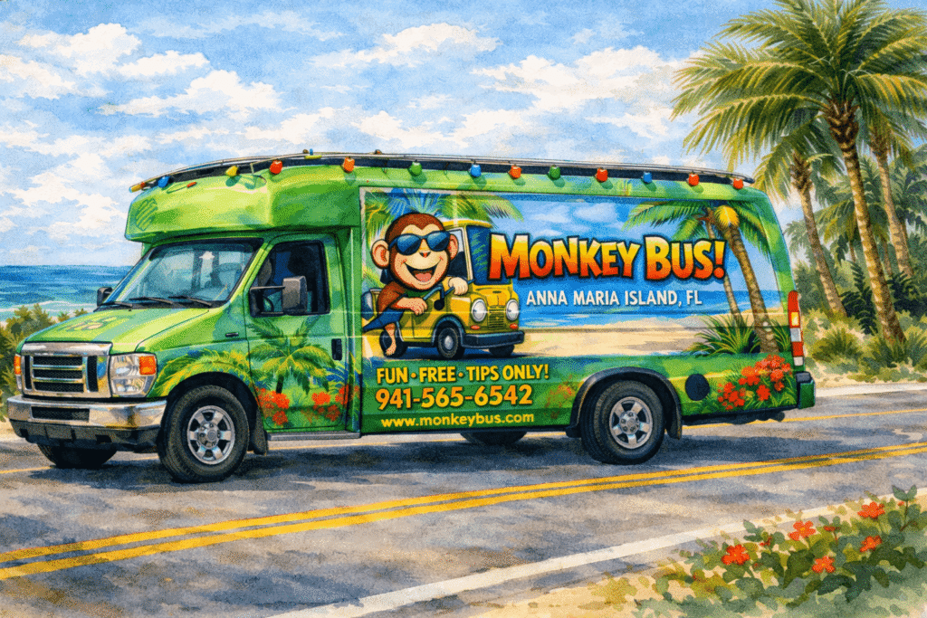 Another fun and popular transportation option on Anna Maria Island is the Monkey Bus, a free, tip-based ride service that travels up and down the island. It’s especially convenient for short trips to beaches, restaurants, bars, and shopping areas without needing to worry about parking.