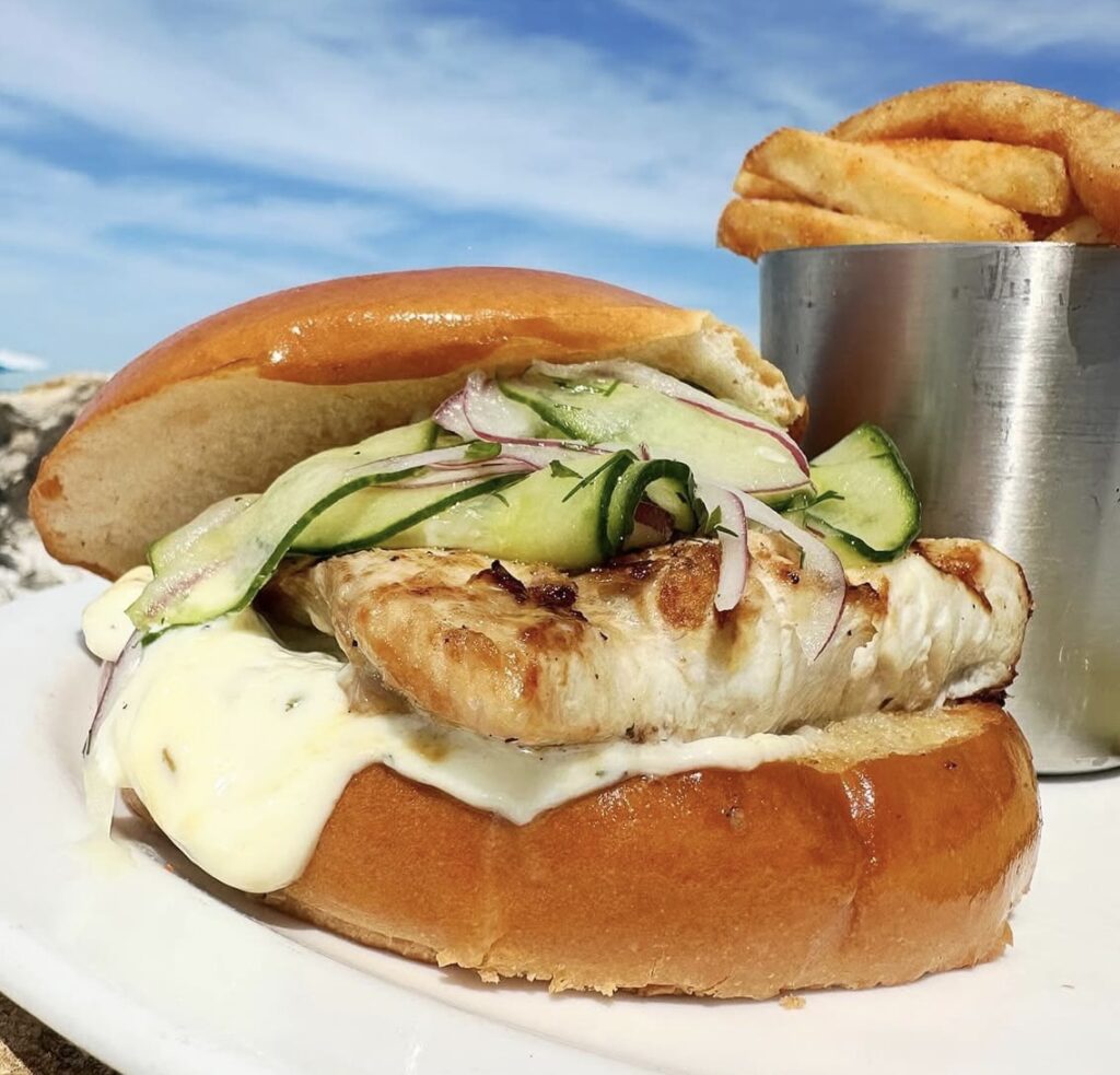 The Beach House Restaurant serves a flavorful fish sandwich featuring sustainably sourced mahi topped with home-made cucumber and dill slaw and zesty lemon aioli. It’s served with a side of fries, making it a fresh and satisfying island favorite.