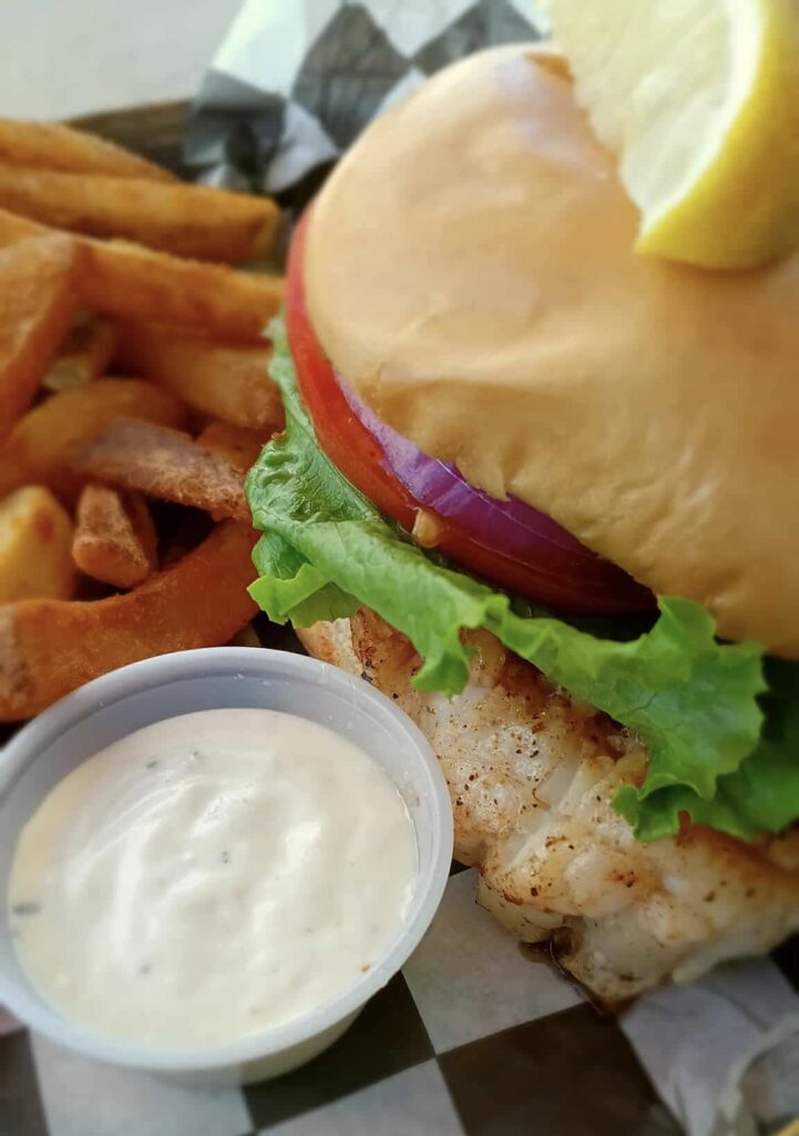 The Freckled Fin serves a fish sandwich made with locally caught fish of the day, prepared grilled, blackened, or fried and topped with lettuce, onion, and tomato. It comes with your choice of side and a generous serving of tartar sauce on the side for the perfect finishing touch.