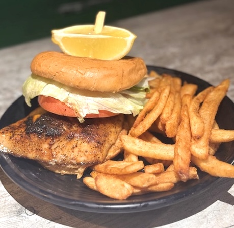 The Grouper Sandwich at The Lazy Lobster features blackened grouper on a toasted potato bun with lettuce, tomato, onion, pickle, and zesty Cajun remoulade. Served with crispy french fries, it’s a flavorful island favorite.
