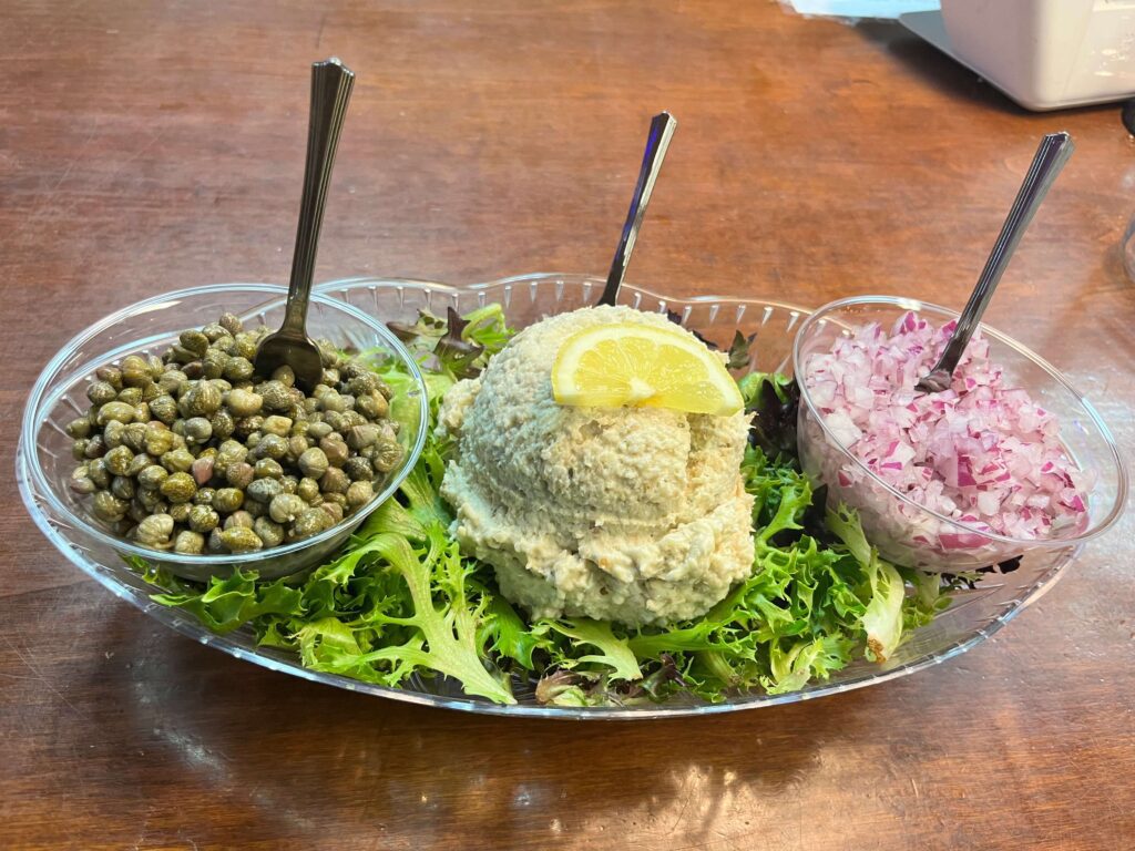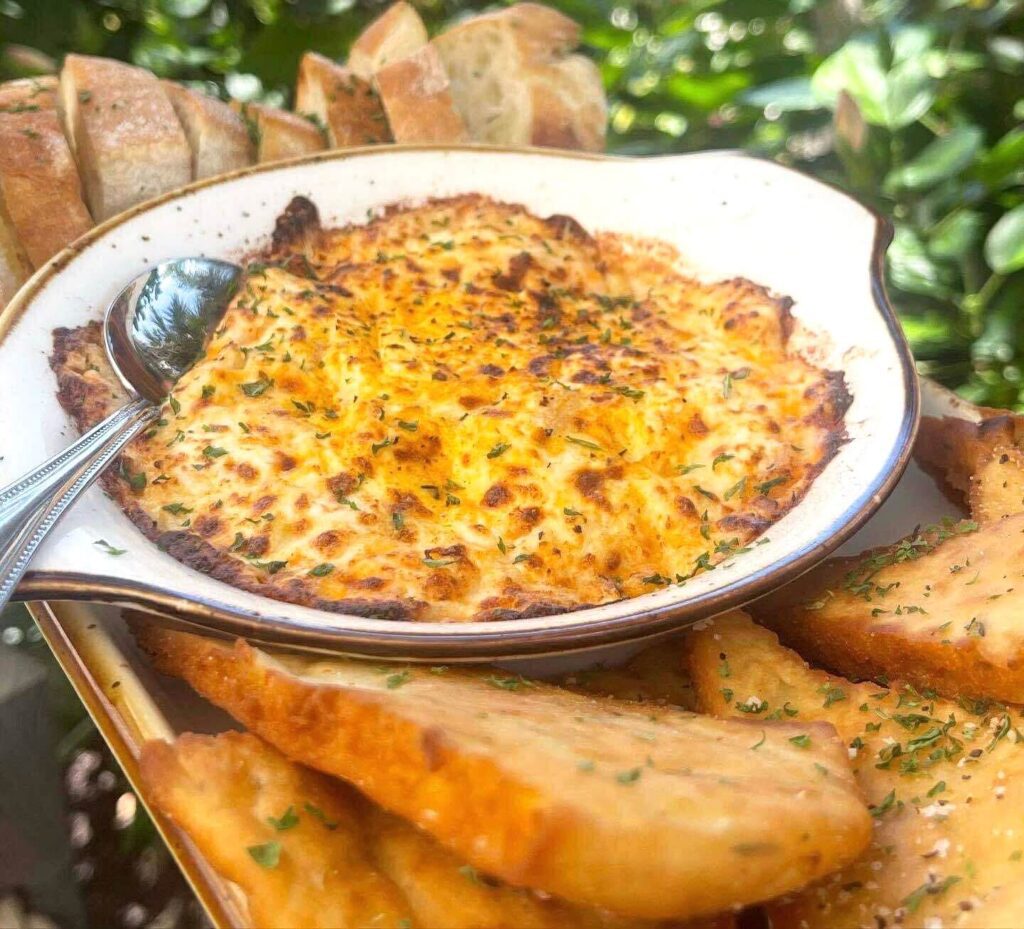 Gulf Drive Café & Kokonut Hut serves their “Fresh Catch” Fish Dip made with a seasoned fish spread topped with capers, red onion, tomatoes, radish, and fresh dill. A lemon wedge adds brightness that balances the rich, savory flavors. Served with toasted pita, this dip is a fresh and vibrant starter perfect for enjoying by the beach.