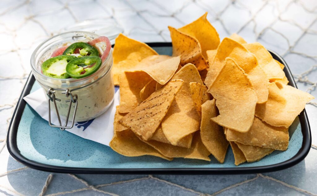 Blue Marlin serves a rich and creamy Gulf Coast Shrimp Spread made with Gulf pink shrimp, cream cheese, green onion, lemon, and Old Bay. It’s topped with parmesan bread crumbs for a savory finish. Served with tortilla chips, this appetizer is a flavorful and coastal-inspired way to kick off your meal.