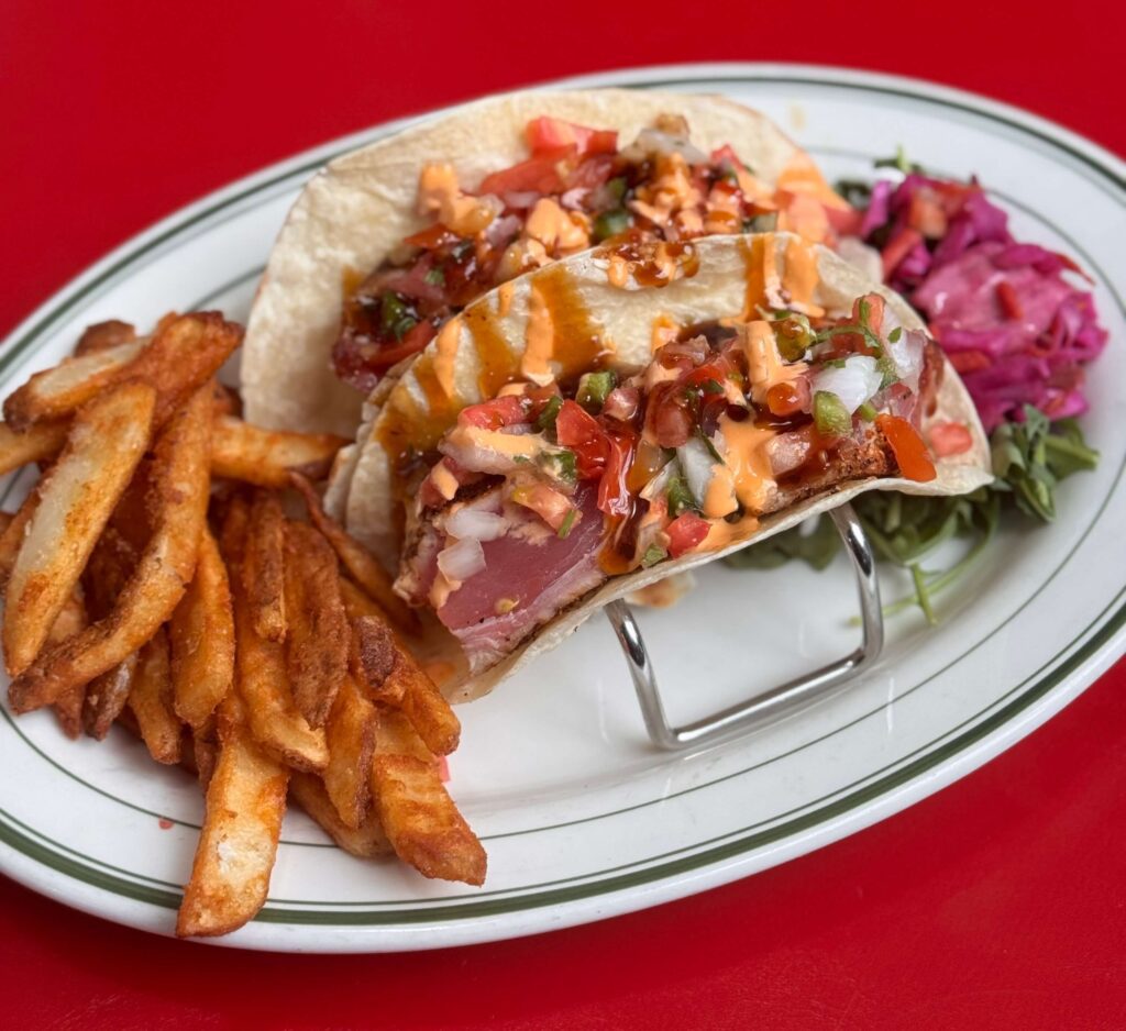 The Ahi Tuna Tacos at the Freckled Fin are a vibrant mix of fresh and bold flavors. Blackened and seared ahi tuna is topped with pico de gallo, spicy mayo, and a sweet soy glaze for the perfect balance of heat and sweetness. Served with pickled cabbage, arugula, and your choice of side, these tacos are a deliciously elevated take on a coastal favorite.